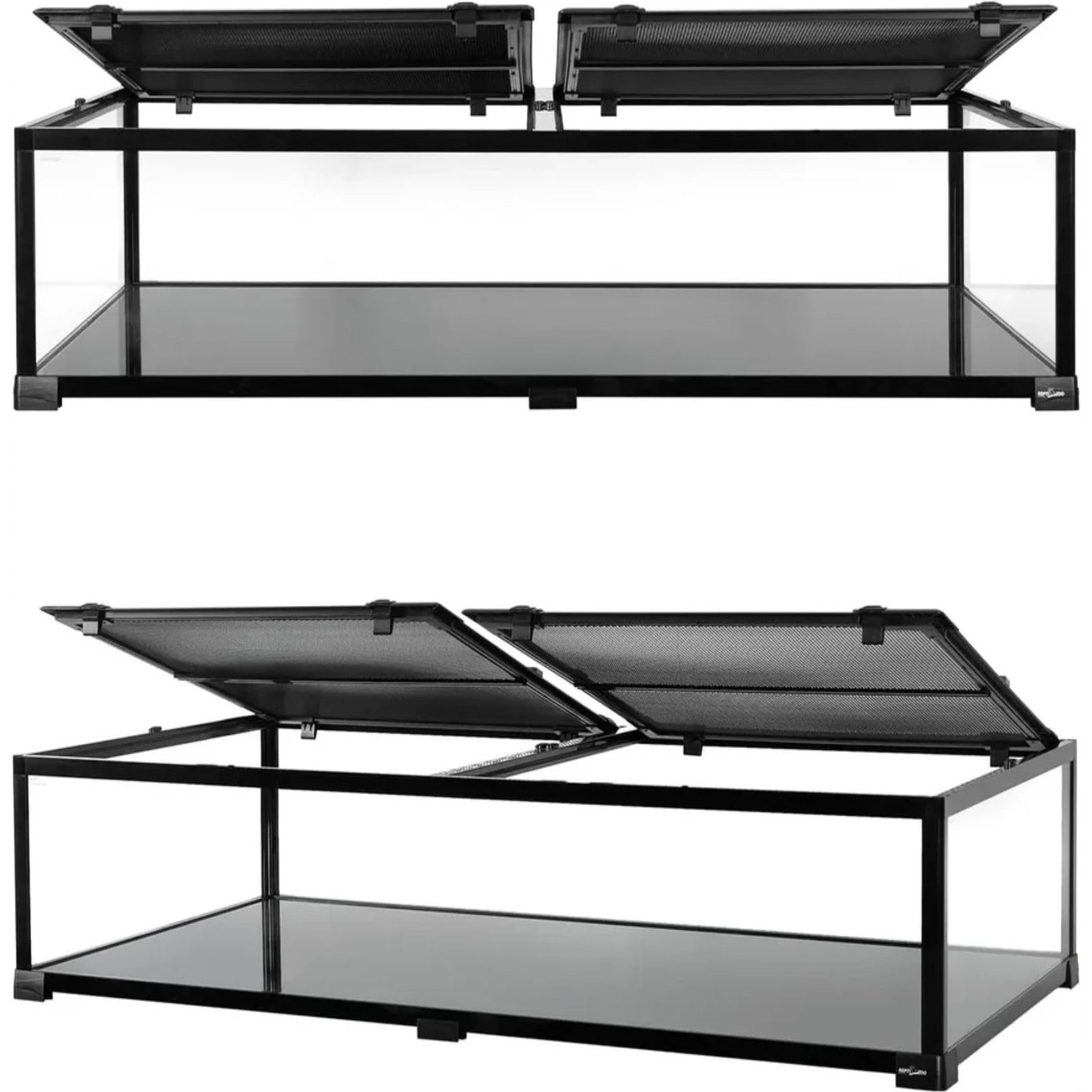 Górna pokrywa z podwójnym otwieraniem pozwala wygodnie karmić zwierzę oraz przeprowadzać prace pielęgnacyjne. Siatkowa konstrukcja zapewnia bardzo dobrą wentylację i umożliwia montaż lamp UVB, IR oraz innych elementów oświetlenia. Specjalnie podniesiona dolna rama umożliwia bezpieczne zastosowanie mat grzewczych, co pomaga utrzymać odpowiedni gradient temperatury – kluczowy dla zdrowia gadów.