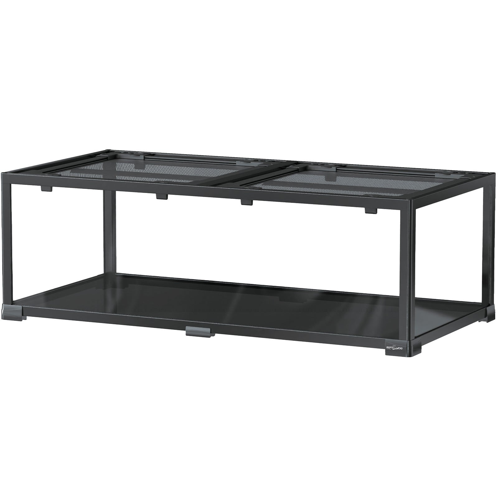 Górna pokrywa z podwójnym otwieraniem pozwala wygodnie karmić zwierzę oraz przeprowadzać prace pielęgnacyjne. Siatkowa konstrukcja zapewnia bardzo dobrą wentylację i umożliwia montaż lamp UVB, IR oraz innych elementów oświetlenia. Specjalnie podniesiona dolna rama umożliwia bezpieczne zastosowanie mat grzewczych, co pomaga utrzymać odpowiedni gradient temperatury – kluczowy dla zdrowia gadów.