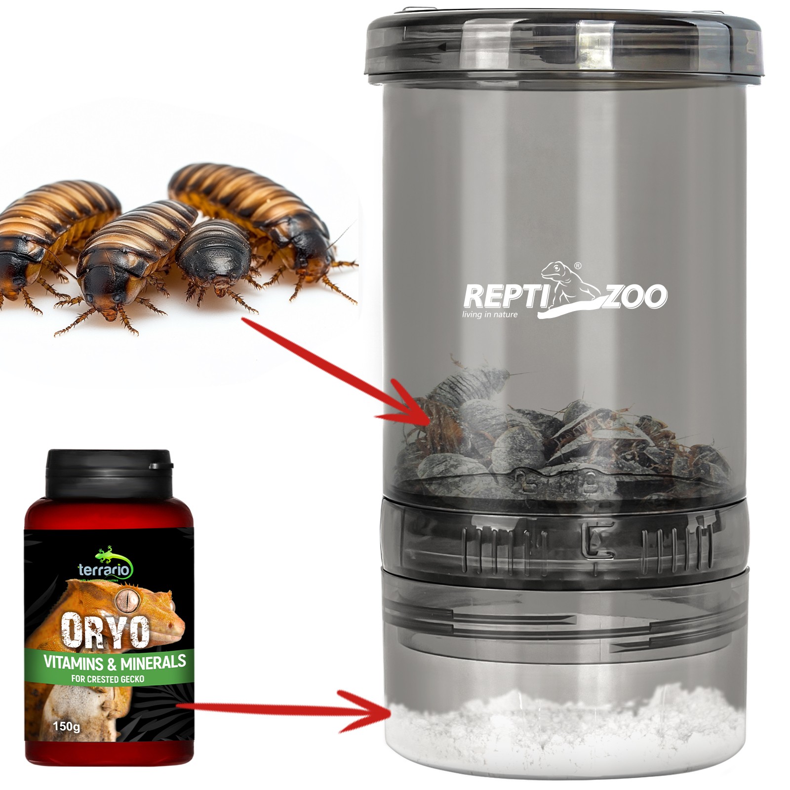 Wystarczy, że wsypiesz do niego świerszcze, larwy mącznika lub inne owady karmowe, zakręcisz pokrywkę i potrząśniesz. Dzięki specjalnej konstrukcji shaker posiada dolną komorę, w której wcześniej wsypujesz wapno i witaminy w proszku. Mechanizm on/off pozwala kontrolować, kiedy wapno i witaminy i w jakiej ilości przedostają się do głównej komory z owadami.